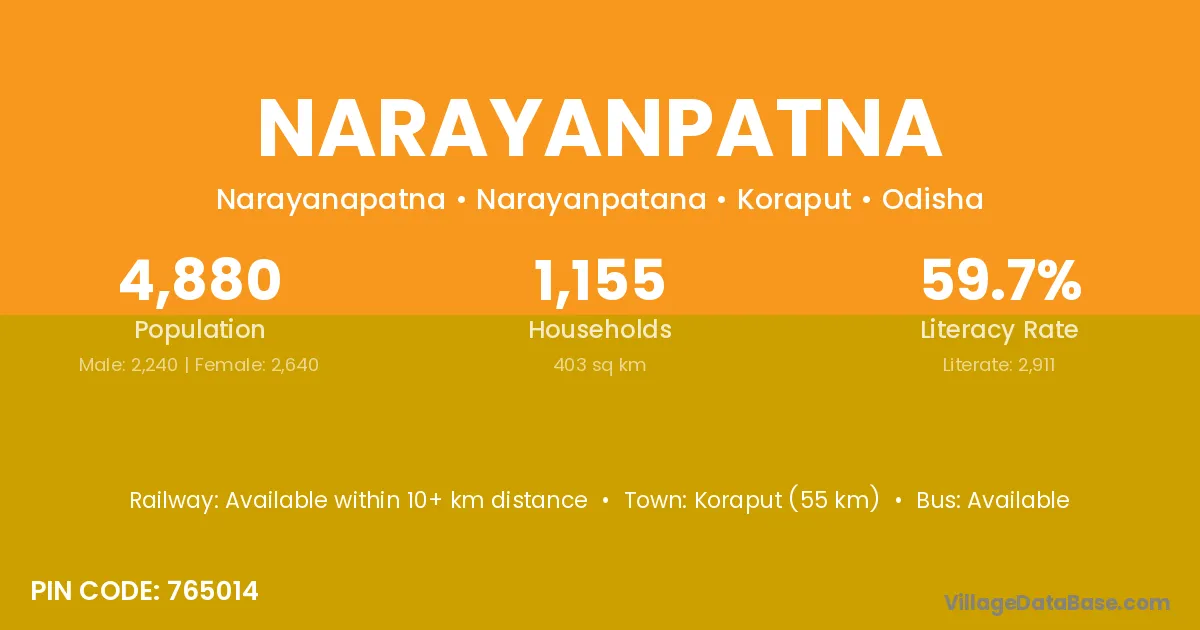 Koraput (55 km) is the nearest town to Narayanpatna village for major economic activities and is located approximately 55 km away.
