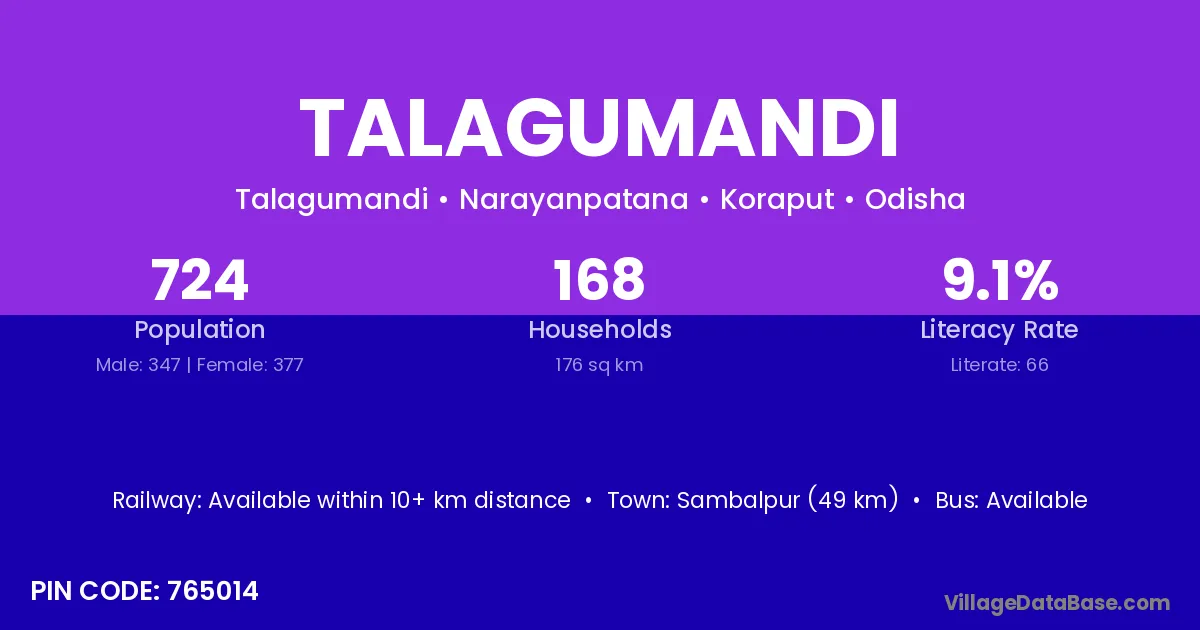Sambalpur (49 km) is the nearest town to Talagumandi village for major economic activities and is located approximately 49 km away.