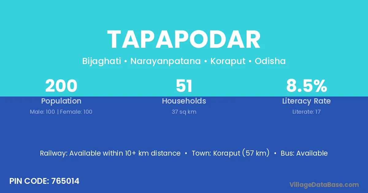 Koraput (57 km) is the nearest town to Tapapodar village for major economic activities and is located approximately 57 km away.