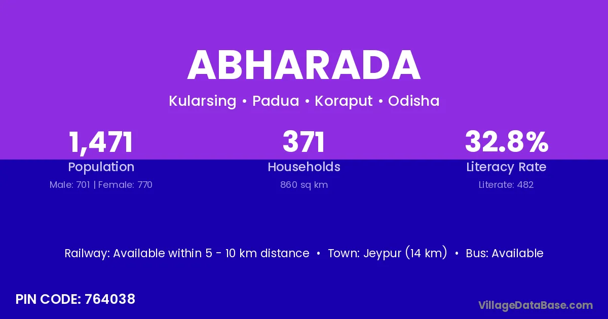 Jeypur (14 km) is the nearest town to Abharada village for major economic activities and is located approximately 14 km away.
