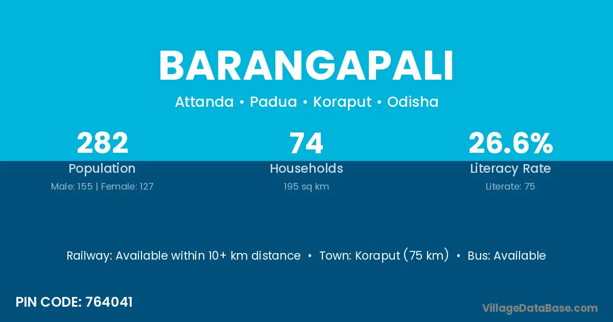 Koraput (75 km) is the nearest town to Barangapali village for major economic activities and is located approximately 75 km away.