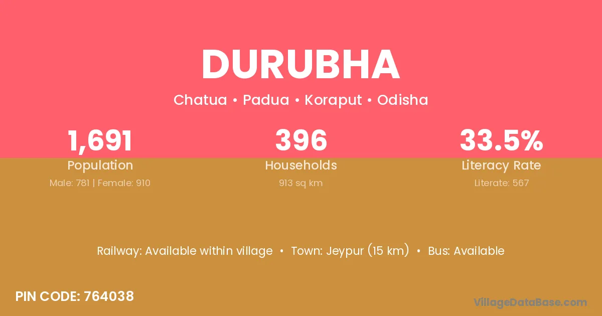 Jeypur (15 km) is the nearest town to Durubha village for major economic activities and is located approximately 15 km away.