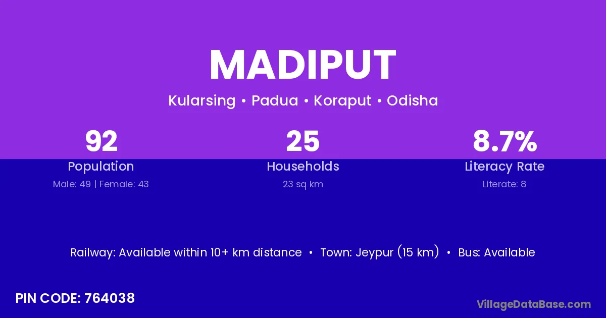 Jeypur (15 km) is the nearest town to Madiput village for major economic activities and is located approximately 15 km away.