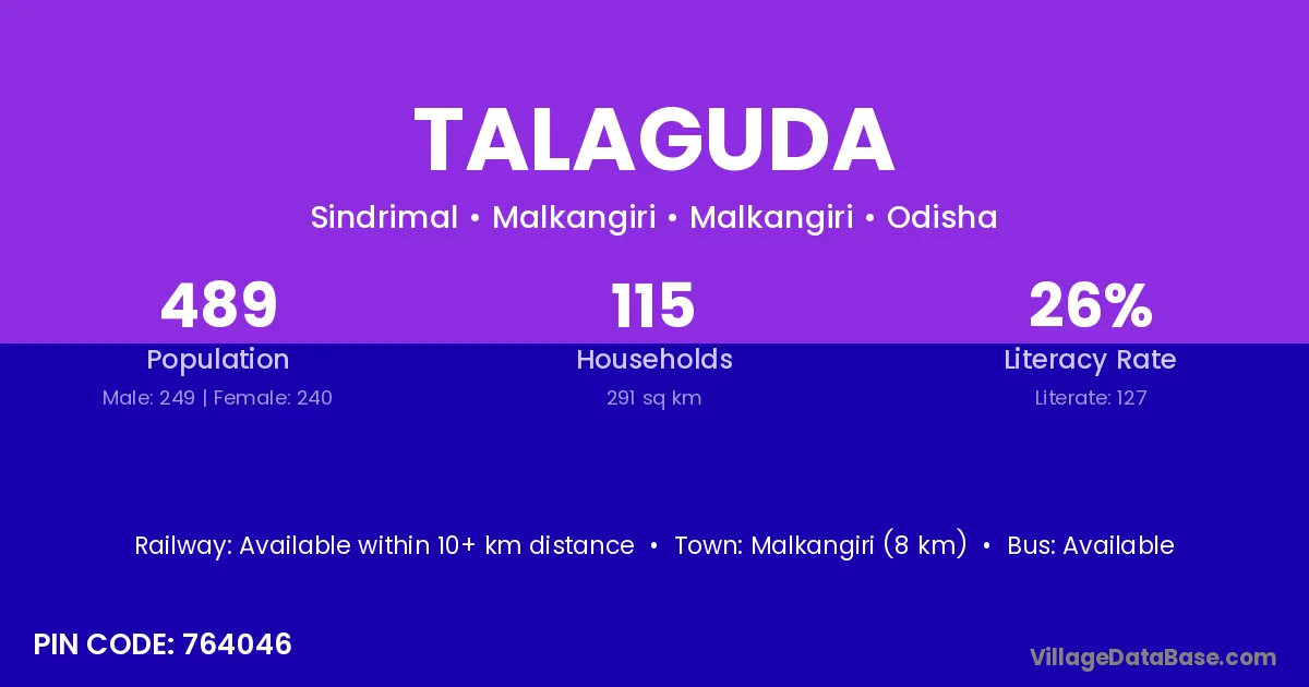 Koraput (75 km) is the nearest town to Talaguda village for major economic activities and is located approximately 75 km away.