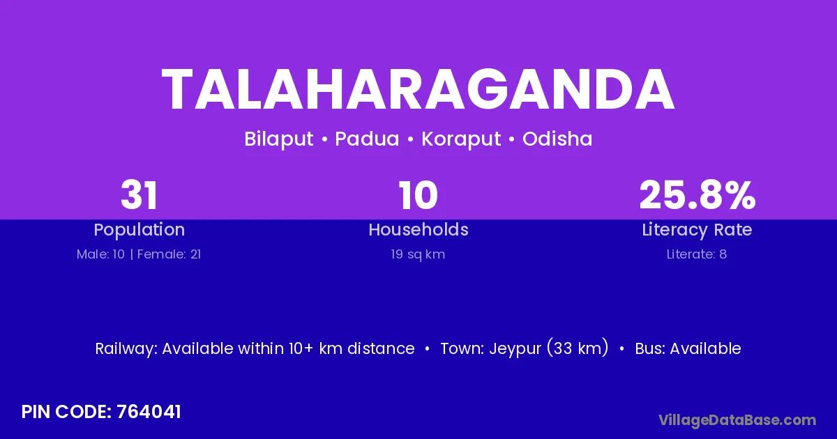 Jeypur (33 km) is the nearest town to Talaharaganda village for major economic activities and is located approximately 33 km away.