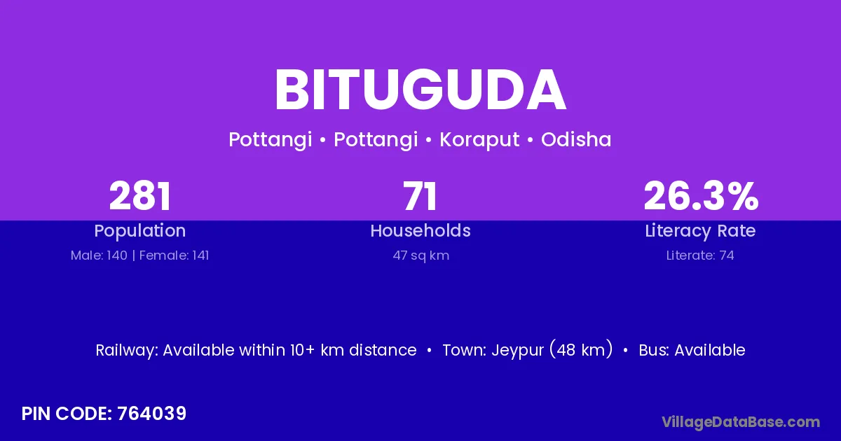 Bituguda village has a total population of 281 people, of which 140 are males and 141 are females.