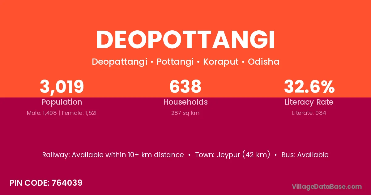 Jeypur (42 km) is the nearest town to Deopottangi village for major economic activities and is located approximately 42 km away.