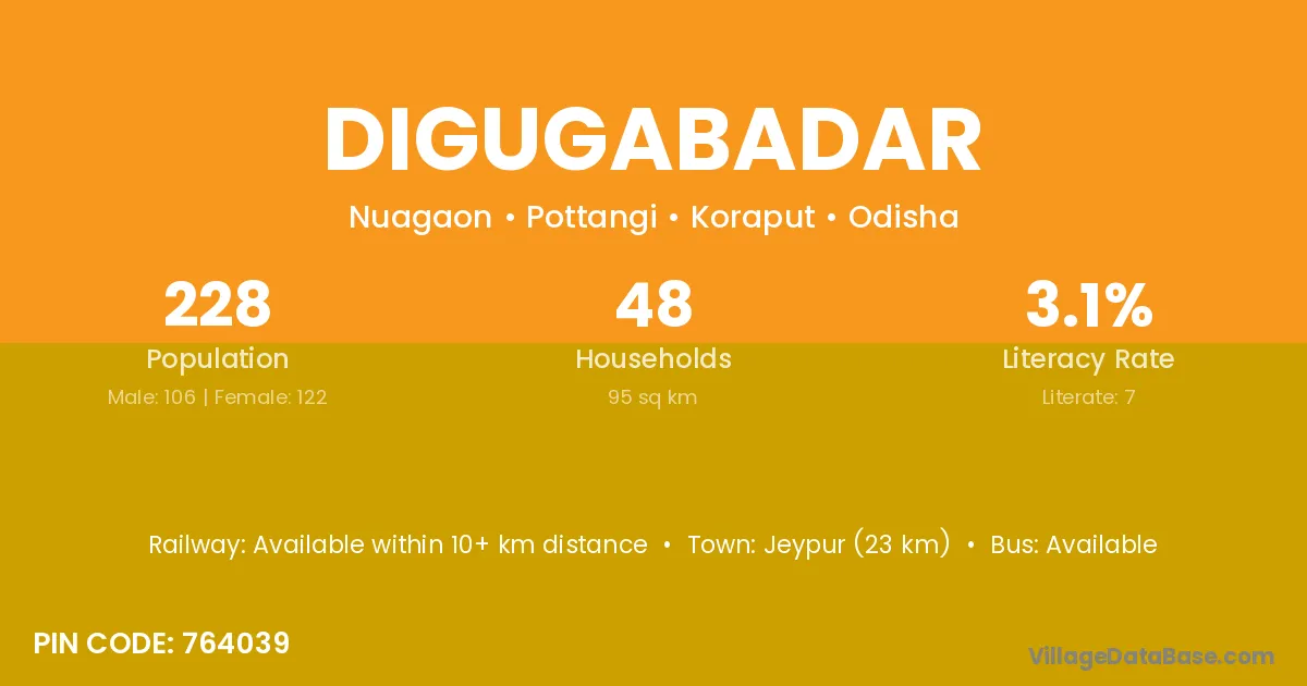 Jeypur (23 km) is the nearest town to Digugabadar village for major economic activities and is located approximately 23 km away.