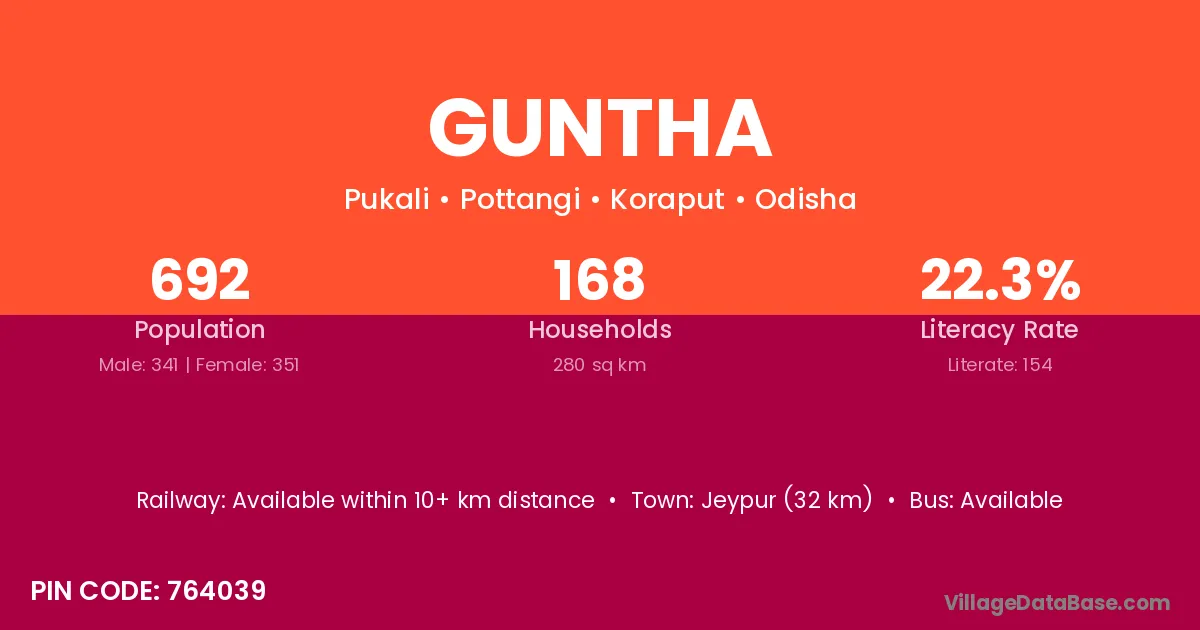 Jeypur (32 km) is the nearest town to Guntha village for major economic activities and is located approximately 32 km away.