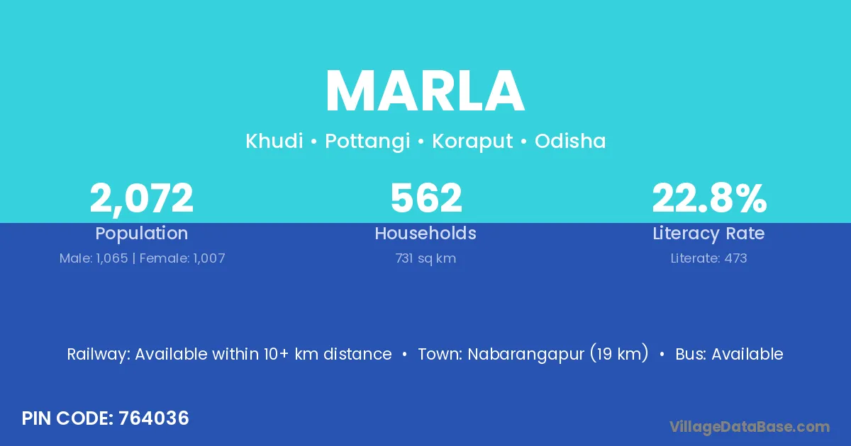 Nabarangapur (19 km) is the nearest town to Marla village for major economic activities and is located approximately 19 km away.