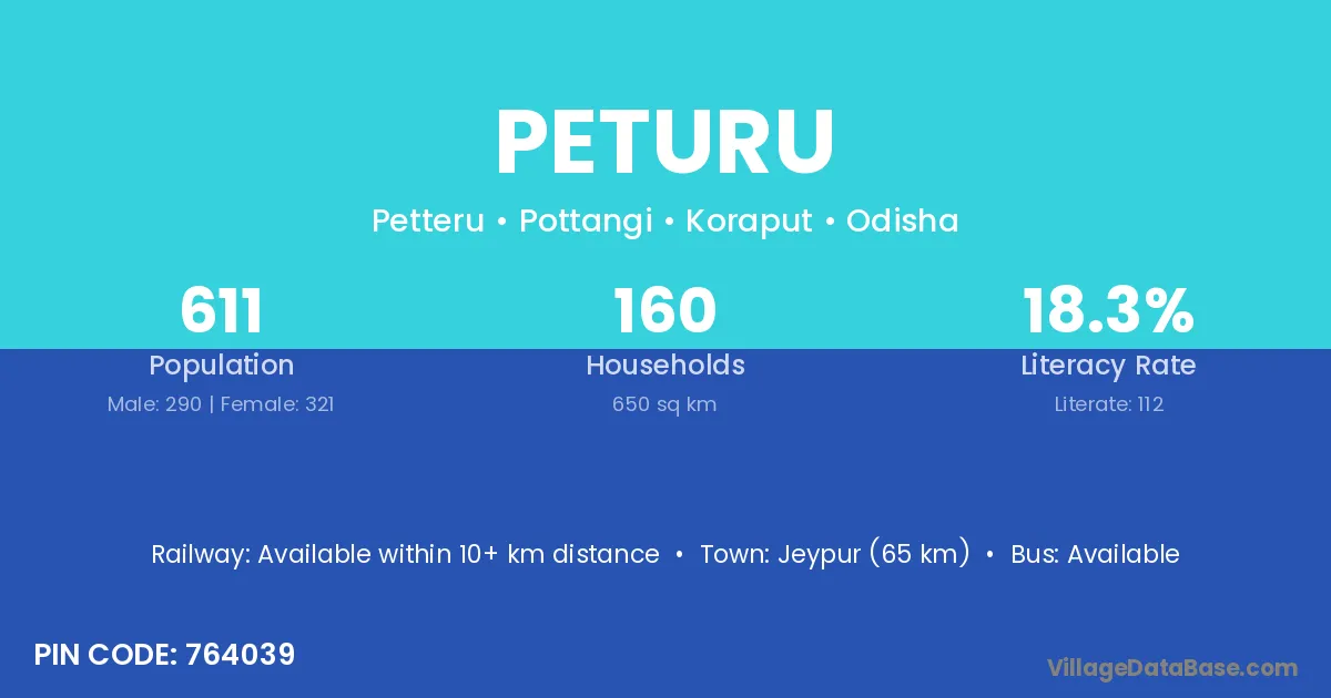 Jeypur (65 km) is the nearest town to Peturu village for major economic activities and is located approximately 65 km away.