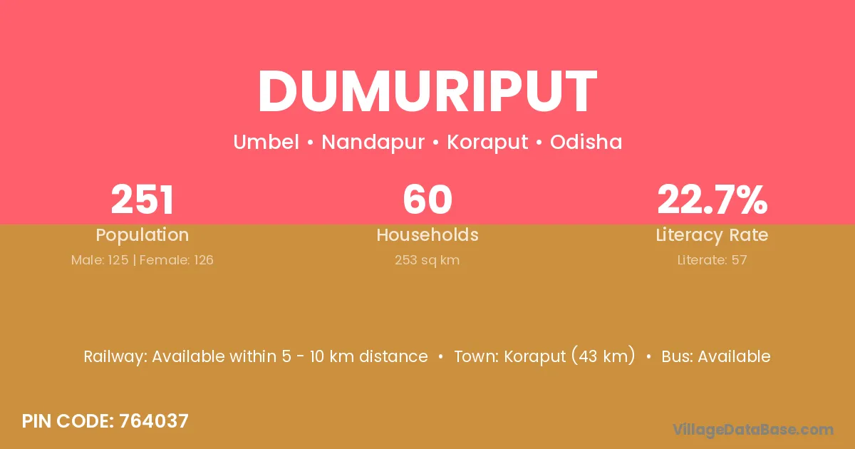 Nabarangapur (7 km) is the nearest town to Dumuriput village for major economic activities and is located approximately 7 km away.