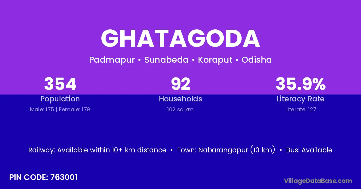 Nabarangapur (10 km) is the nearest town to Ghatagoda village for major economic activities and is located approximately 10 km away.
