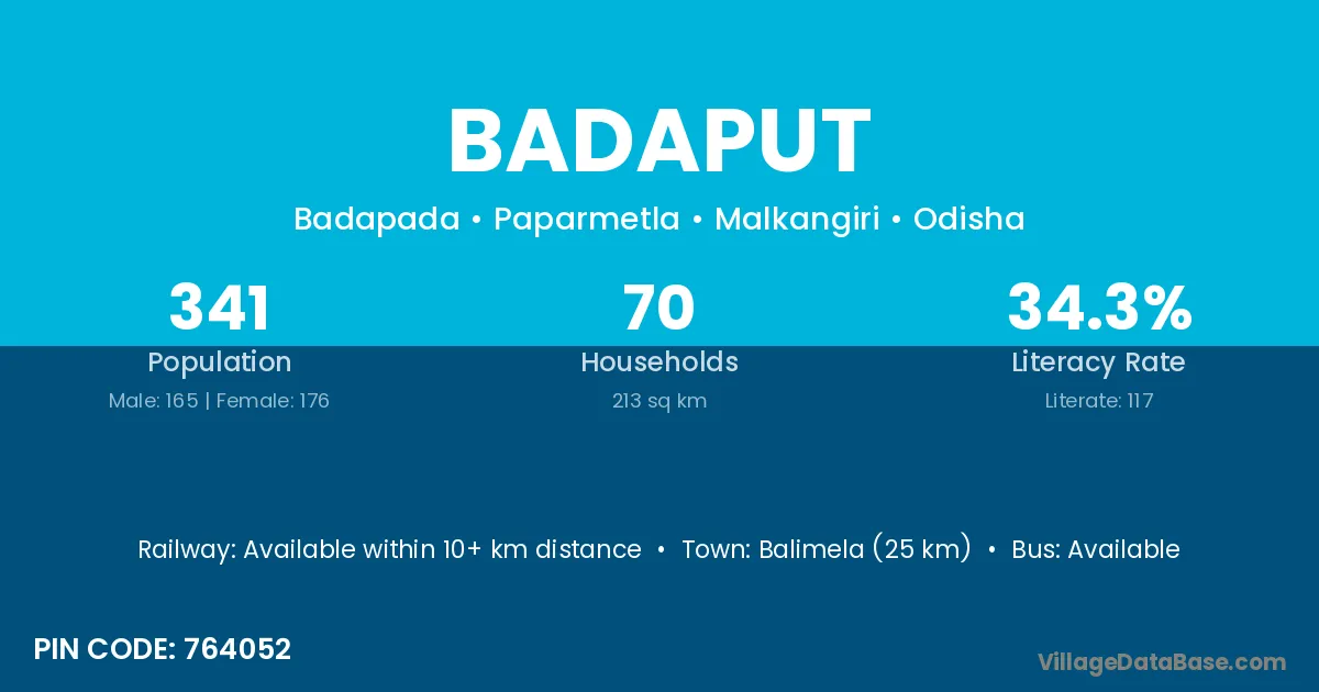 Balimela (36 km) is the nearest town to Badaput village for major economic activities and is located approximately 36 km away.