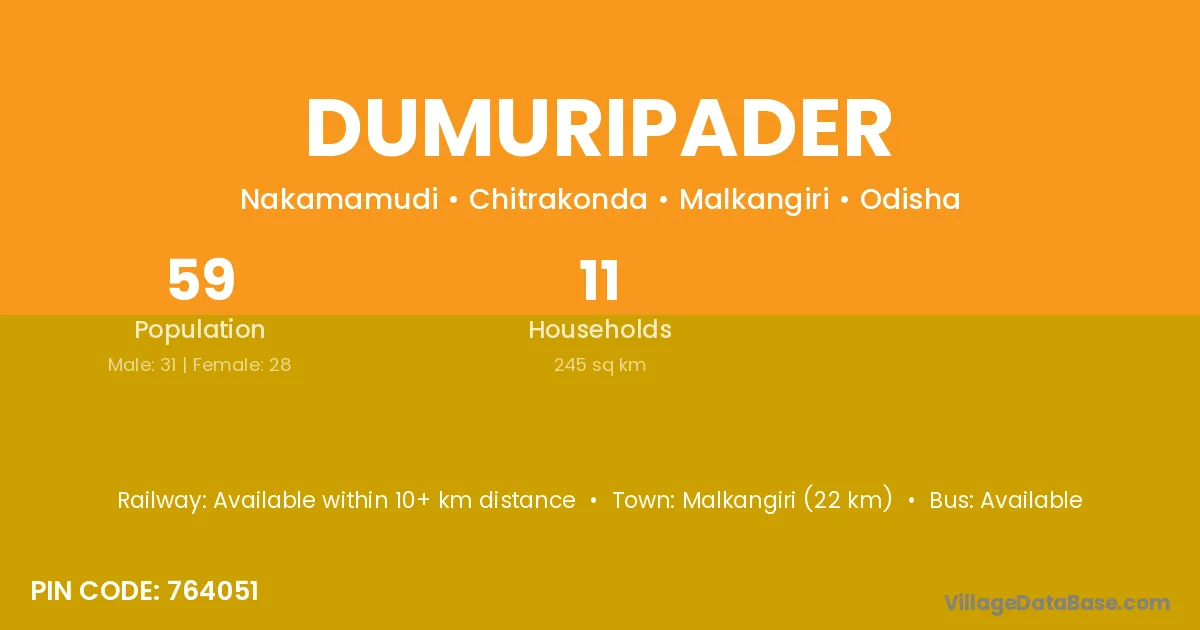 Malkangiri (22 km) is the nearest town to Dumuripader village for major economic activities and is located approximately 22 km away.