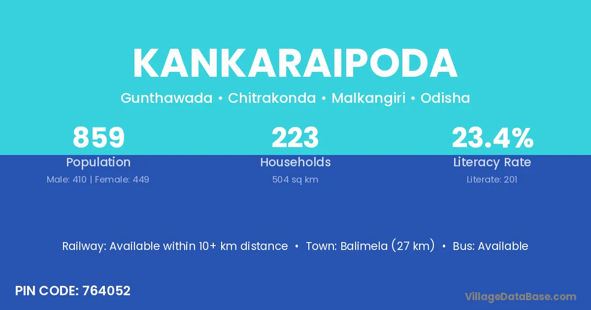 Kankaraipoda village has a total population of 859 people, of which 410 are males and 449 are females.