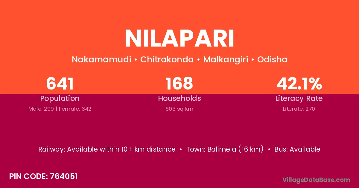 Balimela (16 km) is the nearest town to Nilapari village for major economic activities and is located approximately 16 km away.