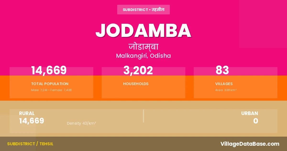 Jodamba is a town and Tehsil in the Malkangiri district of the Odisha. In India, a Tehsil is a subdivision of a district responsible for the administration and revenue collection of a specific area within the district. Tehsils play a crucial role in the local governance structure, contributing significantly to the development and administration of their communities.