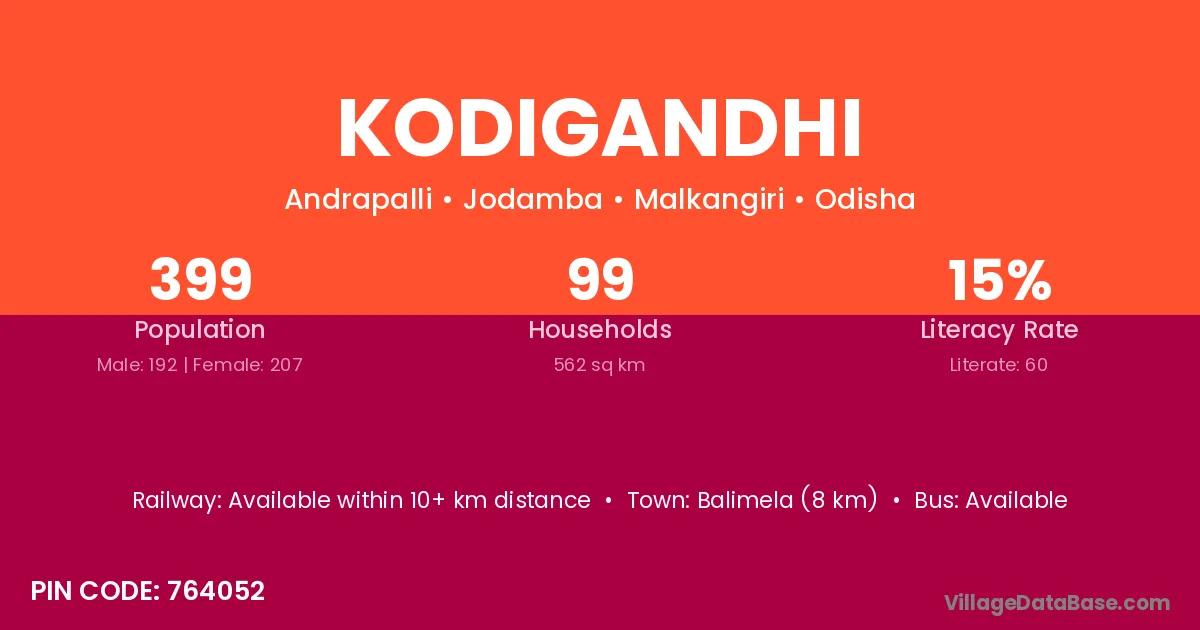 Balimela (8 km) is the nearest town to Kodigandhi village for major economic activities and is located approximately 8 km away.