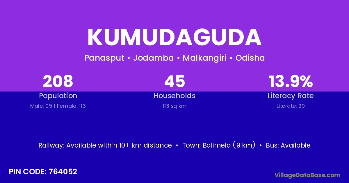 Kumudaguda village has a total population of 208 people, of which 95 are males and 113 are females.