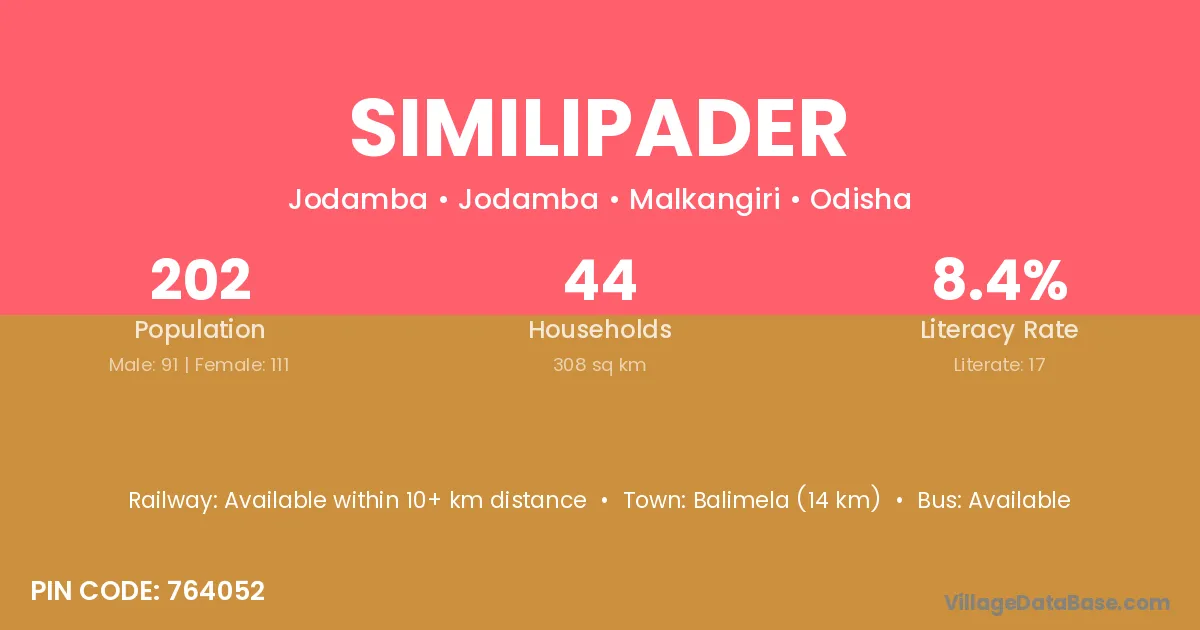 Balimela (14 km) is the nearest town to Similipader village for major economic activities and is located approximately 14 km away.