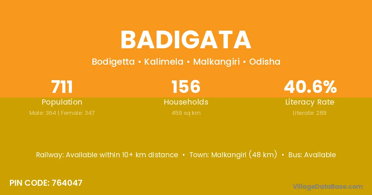 Malkangiri (48 km) is the nearest town to Badigata village for major economic activities and is located approximately 48 km away.