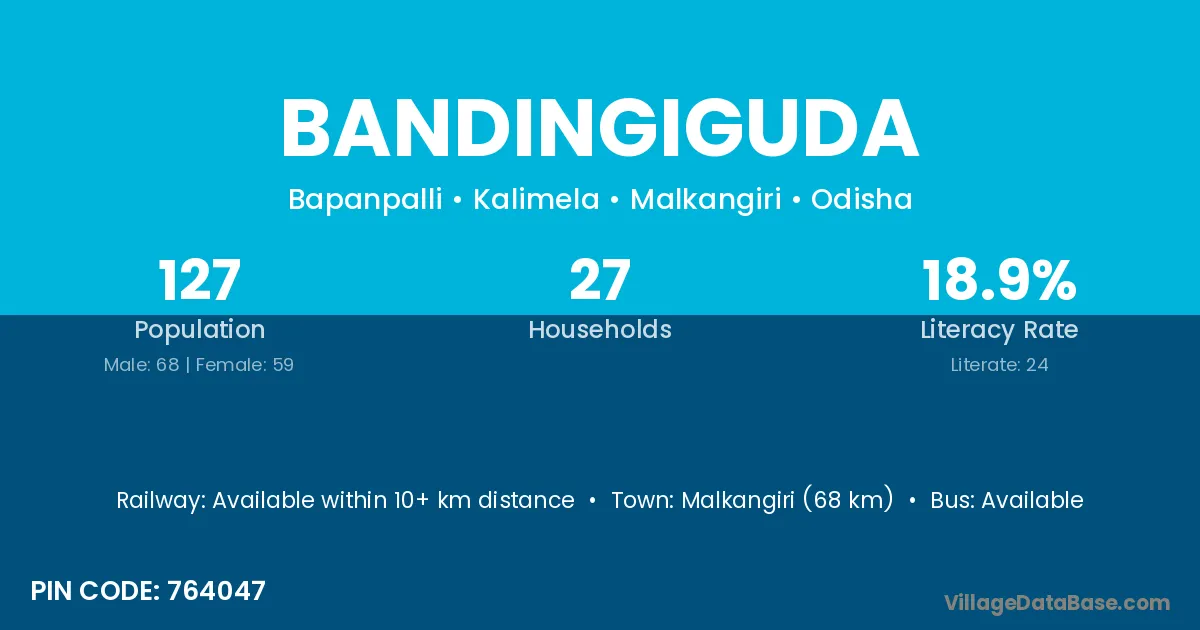 Malkangiri (68 km) is the nearest town to Bandingiguda village for major economic activities and is located approximately 68 km away.