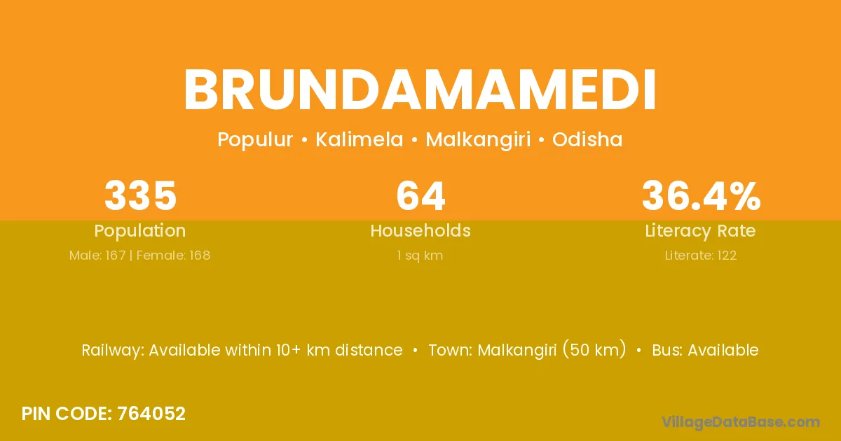 Malkangiri (50 km) is the nearest town to Brundamamedi village for major economic activities and is located approximately 50 km away.