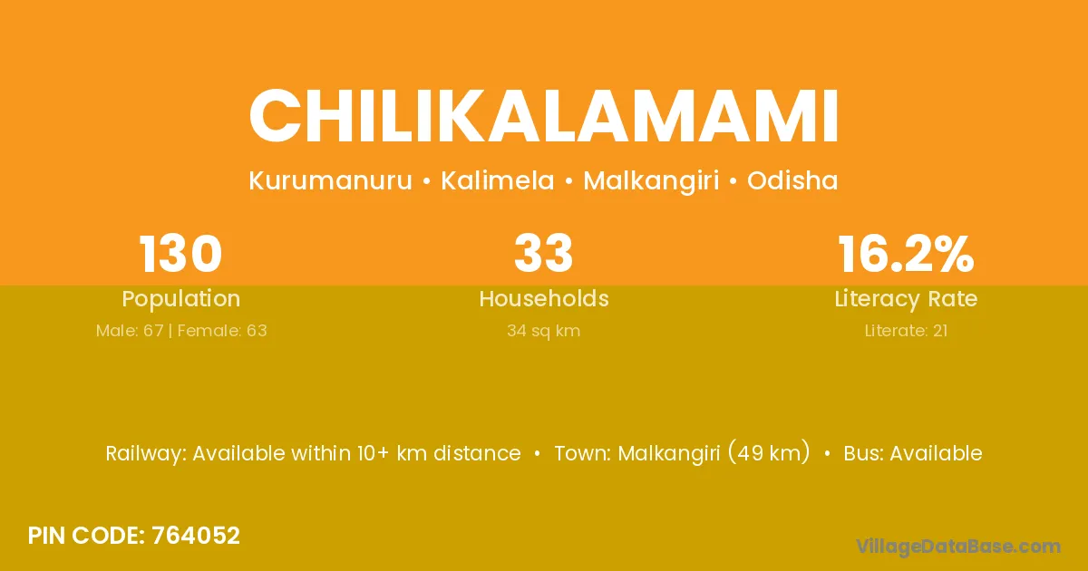 Malkangiri (49 km) is the nearest town to Chilikalamami village for major economic activities and is located approximately 49 km away.