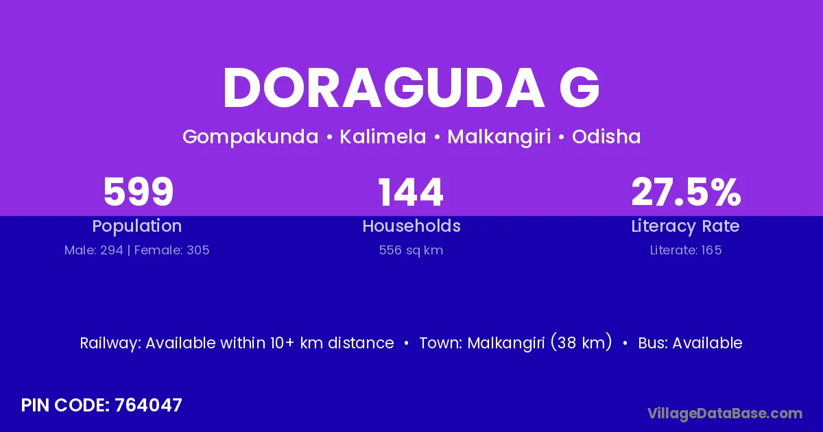 Malkangiri (38 km) is the nearest town to Doraguda G village for major economic activities and is located approximately 38 km away.