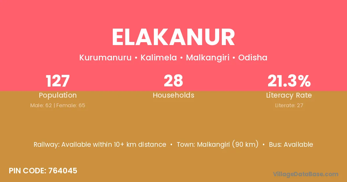 Malkangiri (90 km) is the nearest town to Elakanur village for major economic activities and is located approximately 90 km away.