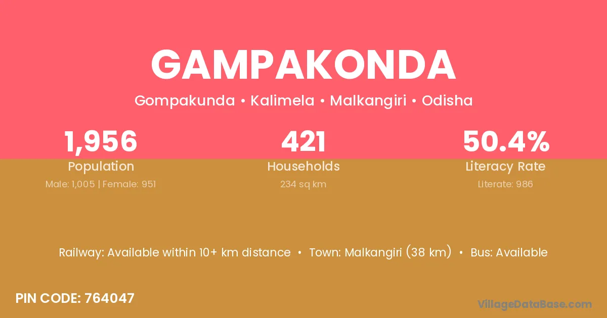 Malkangiri (38 km) is the nearest town to Gampakonda village for major economic activities and is located approximately 38 km away.