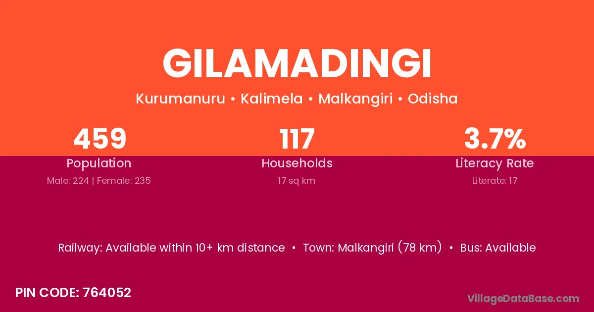 Malkangiri (78 km) is the nearest town to Gilamadingi village for major economic activities and is located approximately 78 km away.