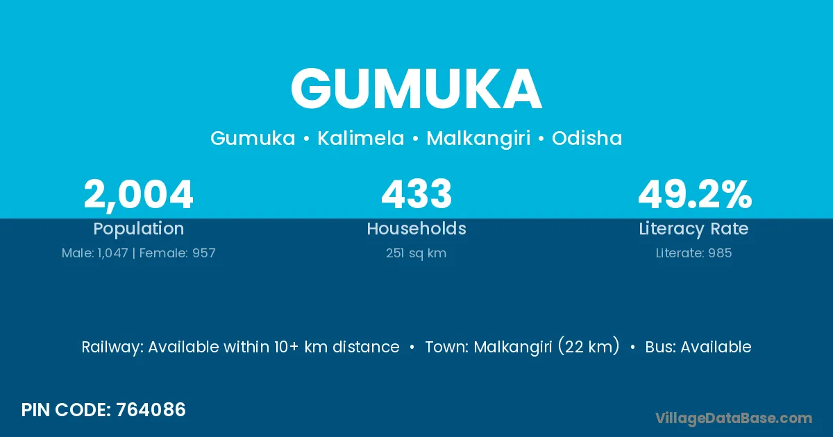 Gumuka village is located in the Kalimela Tehsil of the Malkangiri district in Odisha .