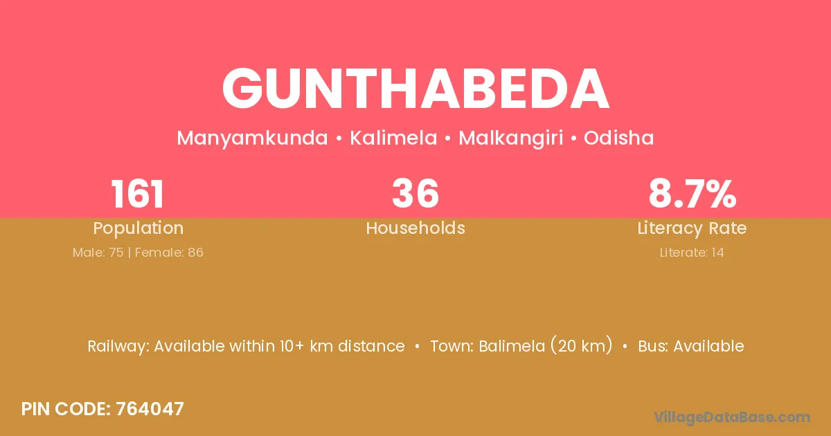 Gunthabeda village is located in the Kalimela Tehsil of the Malkangiri district in Odisha .