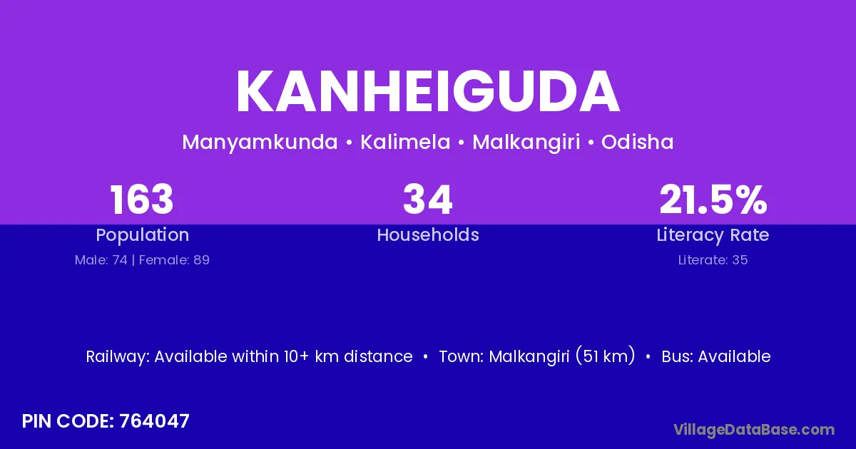 Malkangiri (51 km) is the nearest town to Kanheiguda village for major economic activities and is located approximately 51 km away.