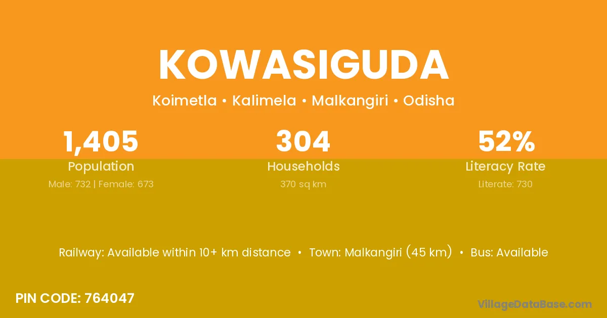 Malkangiri (45 km) is the nearest town to Kowasiguda village for major economic activities and is located approximately 45 km away.