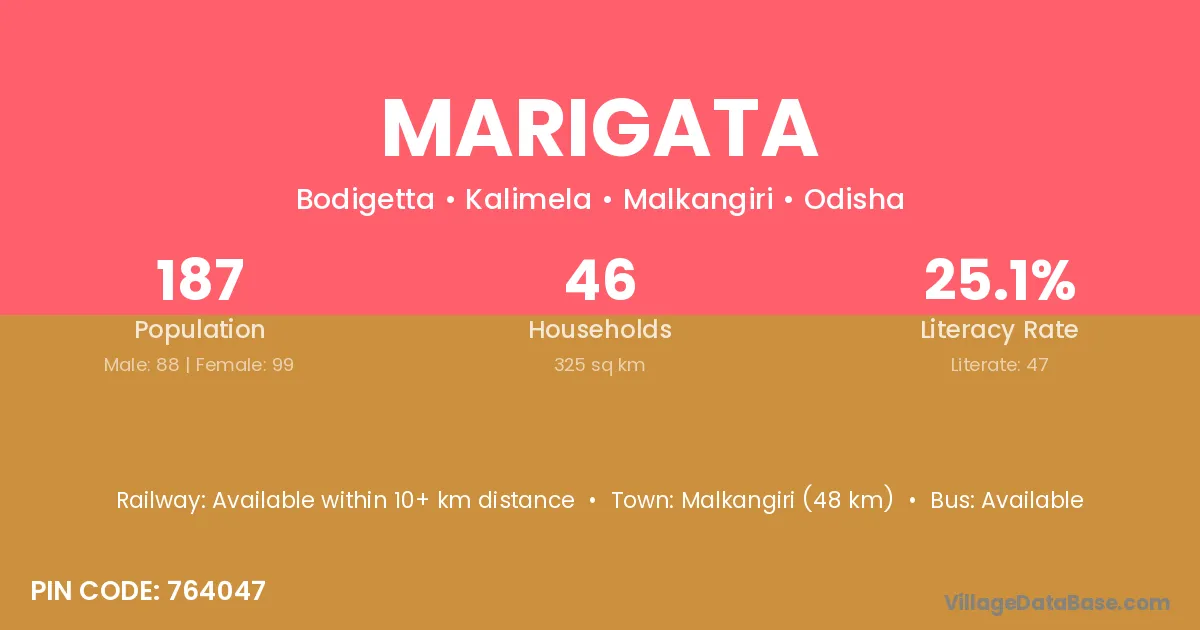 Malkangiri (48 km) is the nearest town to Marigata village for major economic activities and is located approximately 48 km away.