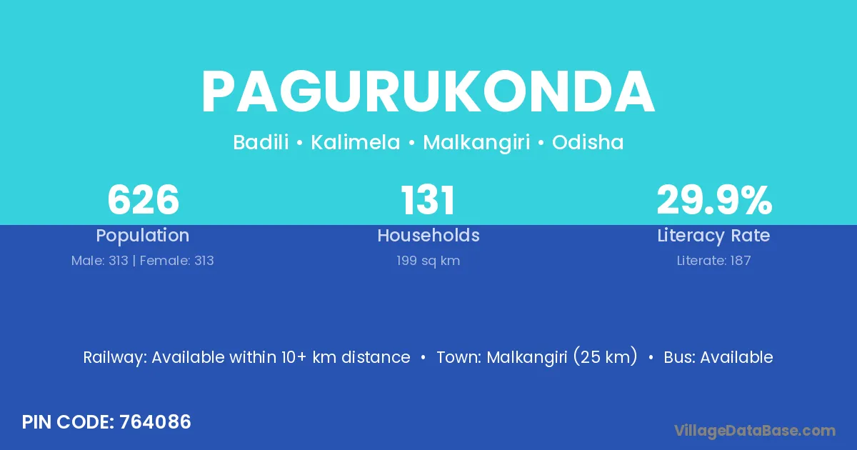 Malkangiri (25 km) is the nearest town to Pagurukonda village for major economic activities and is located approximately 25 km away.