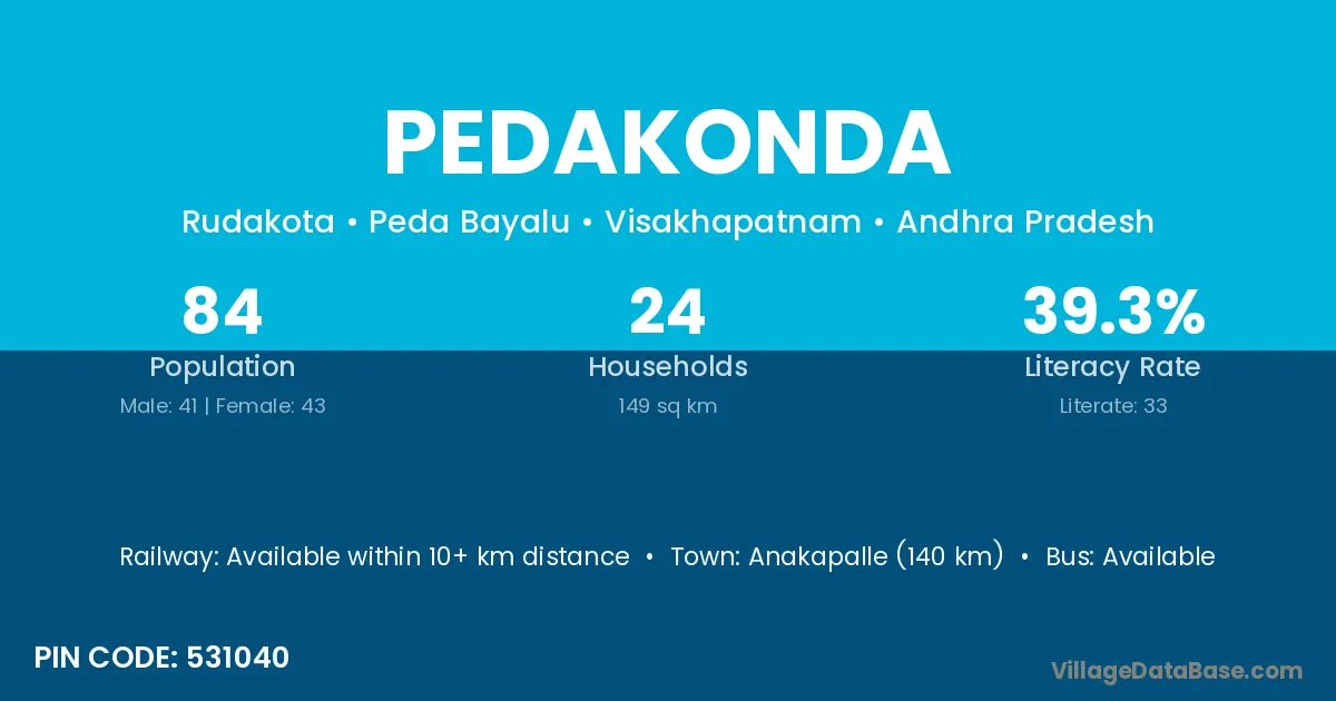 Malkangiri (70 km) is the nearest town to Pedakonda village for major economic activities and is located approximately 70 km away.