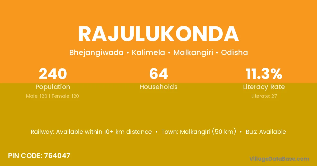 Malkangiri (50 km) is the nearest town to Rajulukonda village for major economic activities and is located approximately 50 km away.