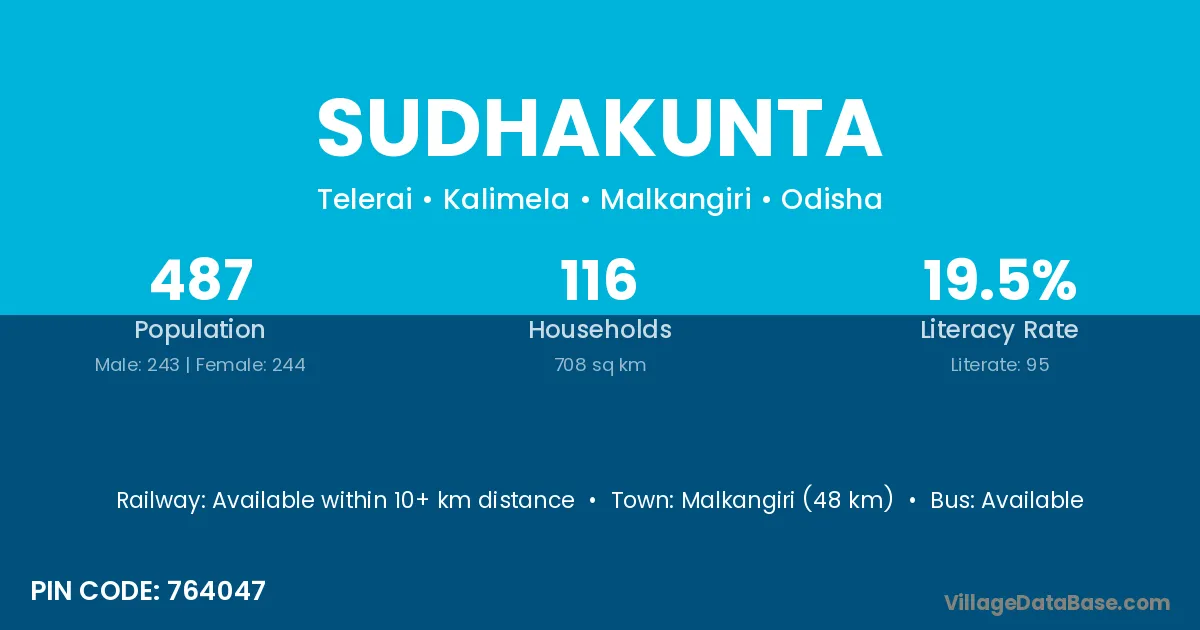 Malkangiri (48 km) is the nearest town to Sudhakunta village for major economic activities and is located approximately 48 km away.