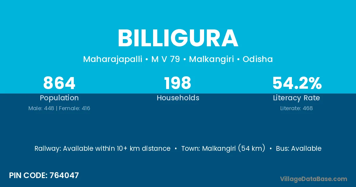 Malkangiri (54 km) is the nearest town to Billigura village for major economic activities and is located approximately 54 km away.