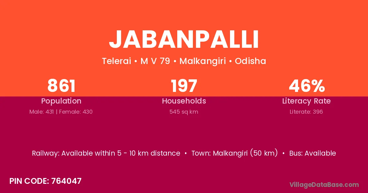 Malkangiri (50 km) is the nearest town to Jabanpalli village for major economic activities and is located approximately 50 km away.