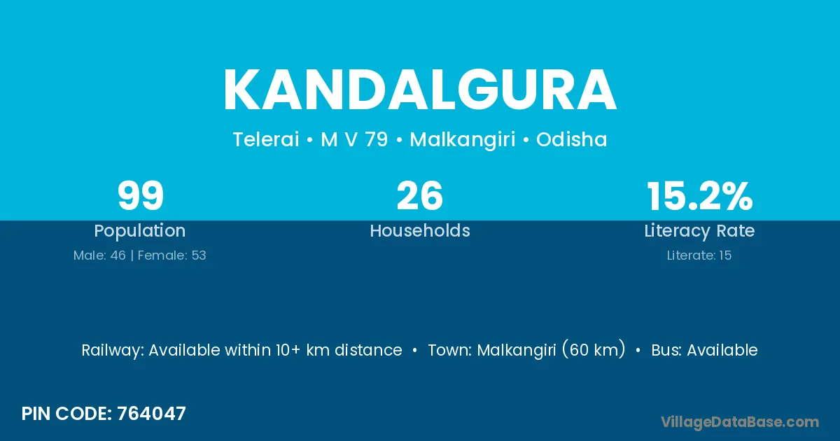 Malkangiri (60 km) is the nearest town to Kandalgura village for major economic activities and is located approximately 60 km away.