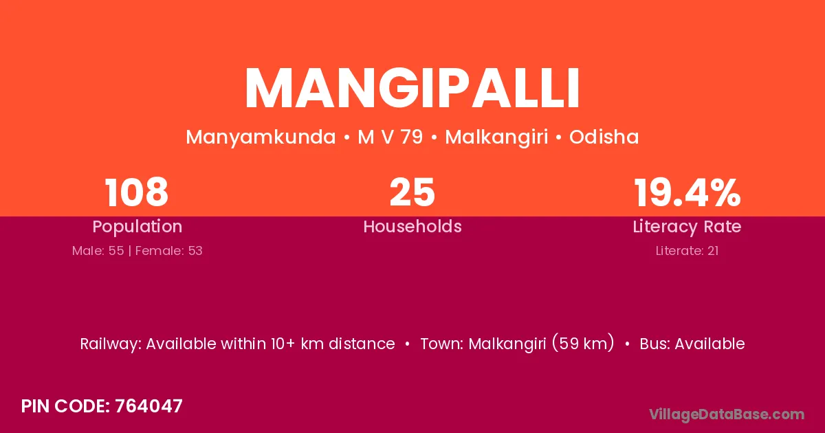 Malkangiri (59 km) is the nearest town to Mangipalli village for major economic activities and is located approximately 59 km away.