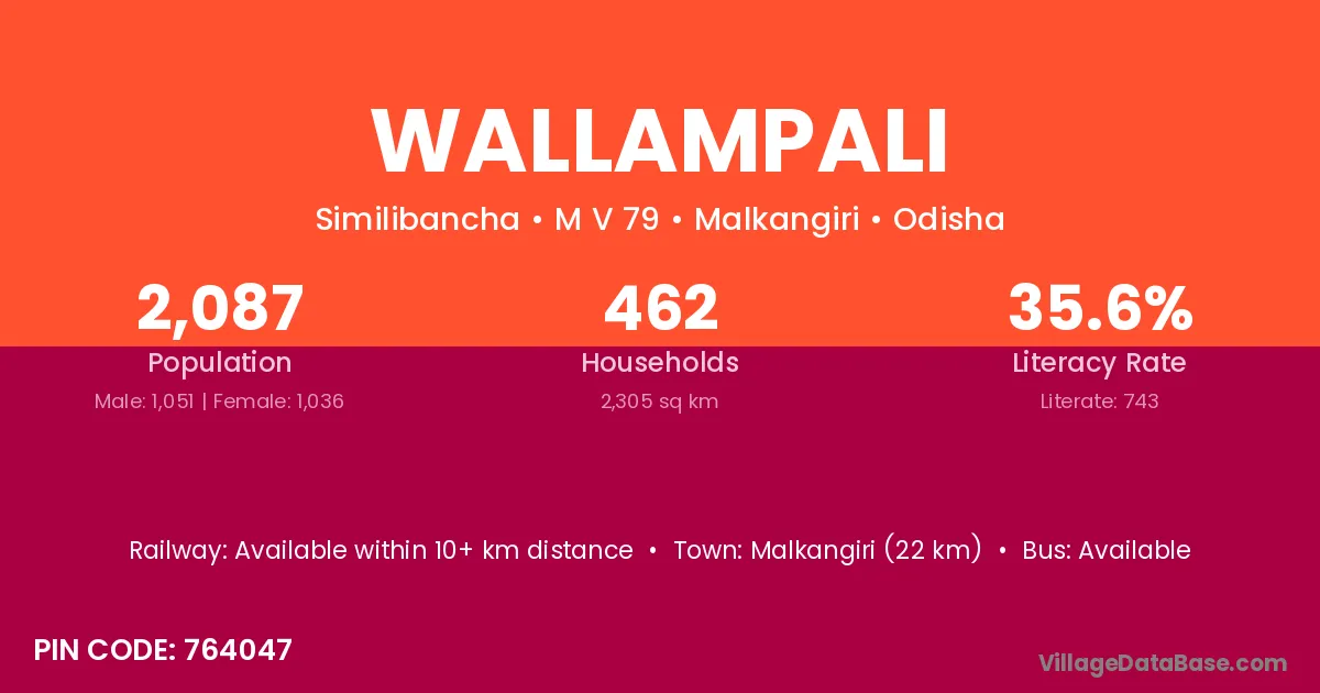 Malkangiri (22 km) is the nearest town to Wallampali village for major economic activities and is located approximately 22 km away.