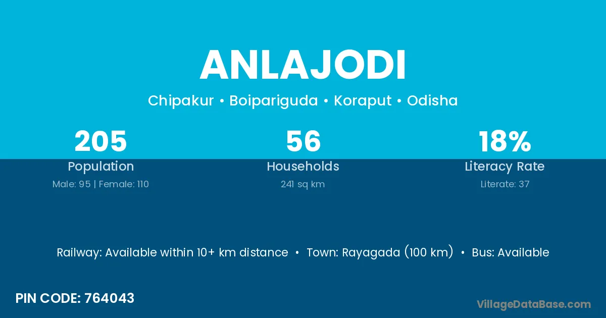 Malkangiri (39 km) is the nearest town to Anlajodi village for major economic activities and is located approximately 39 km away.