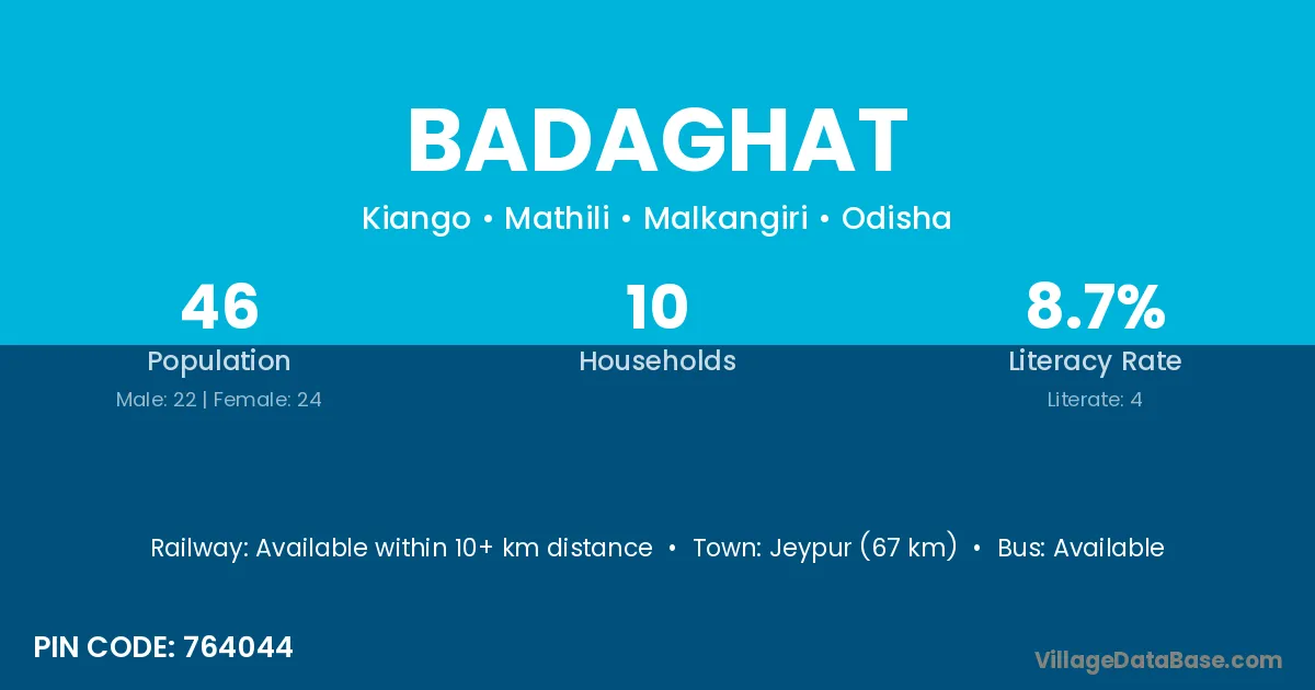 Jeypur (67 km) is the nearest town to Badaghat village for major economic activities and is located approximately 67 km away.
