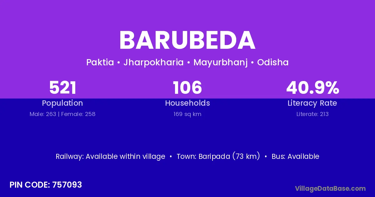 Malkangiri (72 km) is the nearest town to Barubeda village for major economic activities and is located approximately 72 km away.